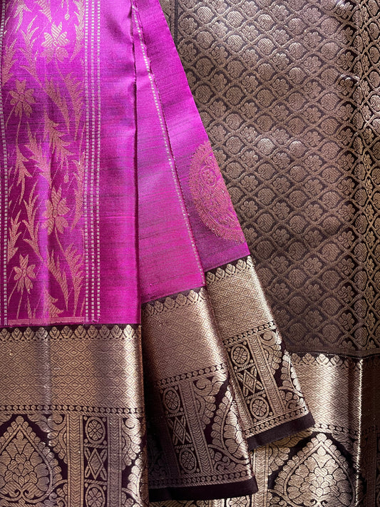Peacock Plume Kanjeevaram in Charcoal Brown and Magenta Pallu