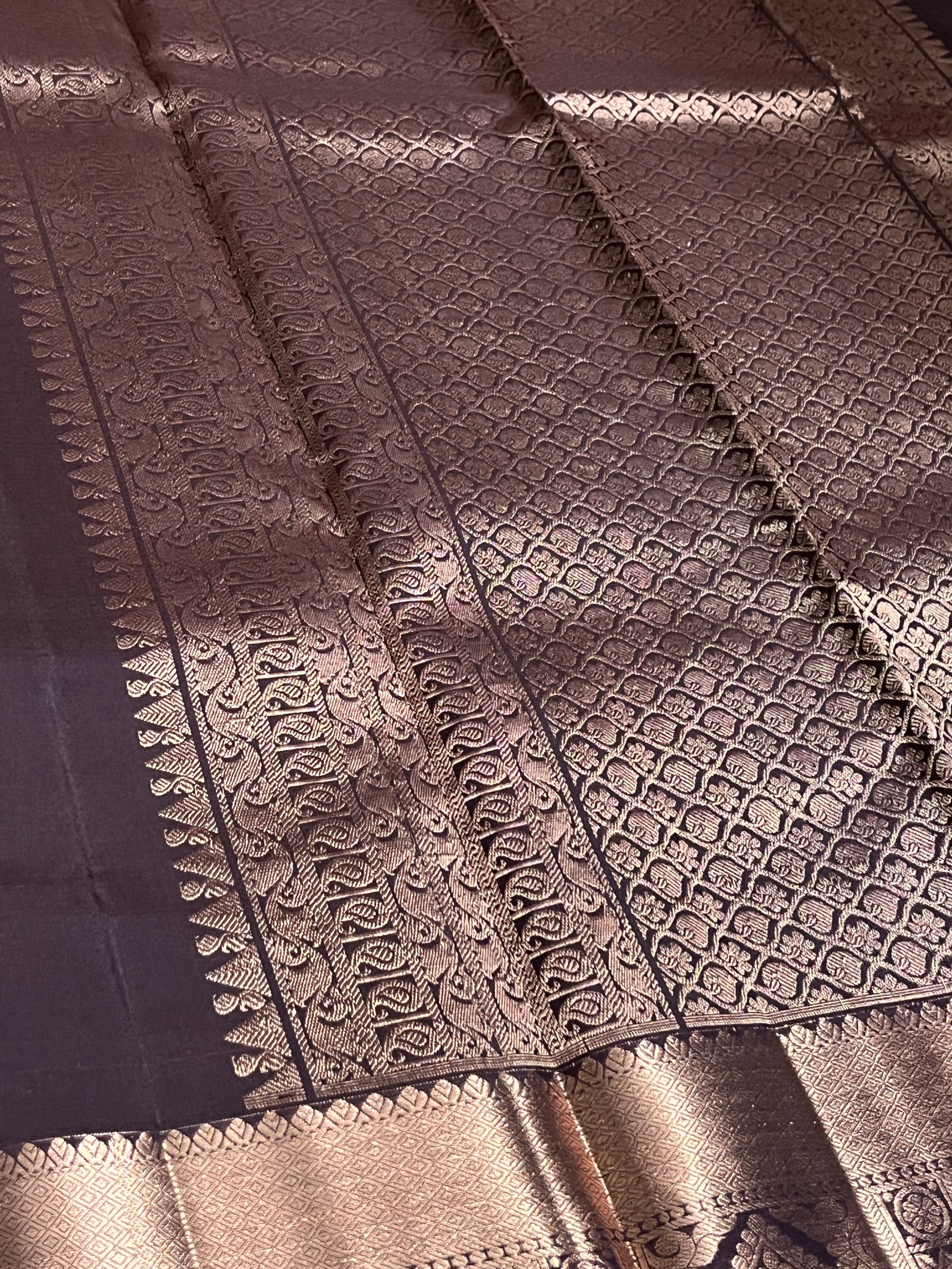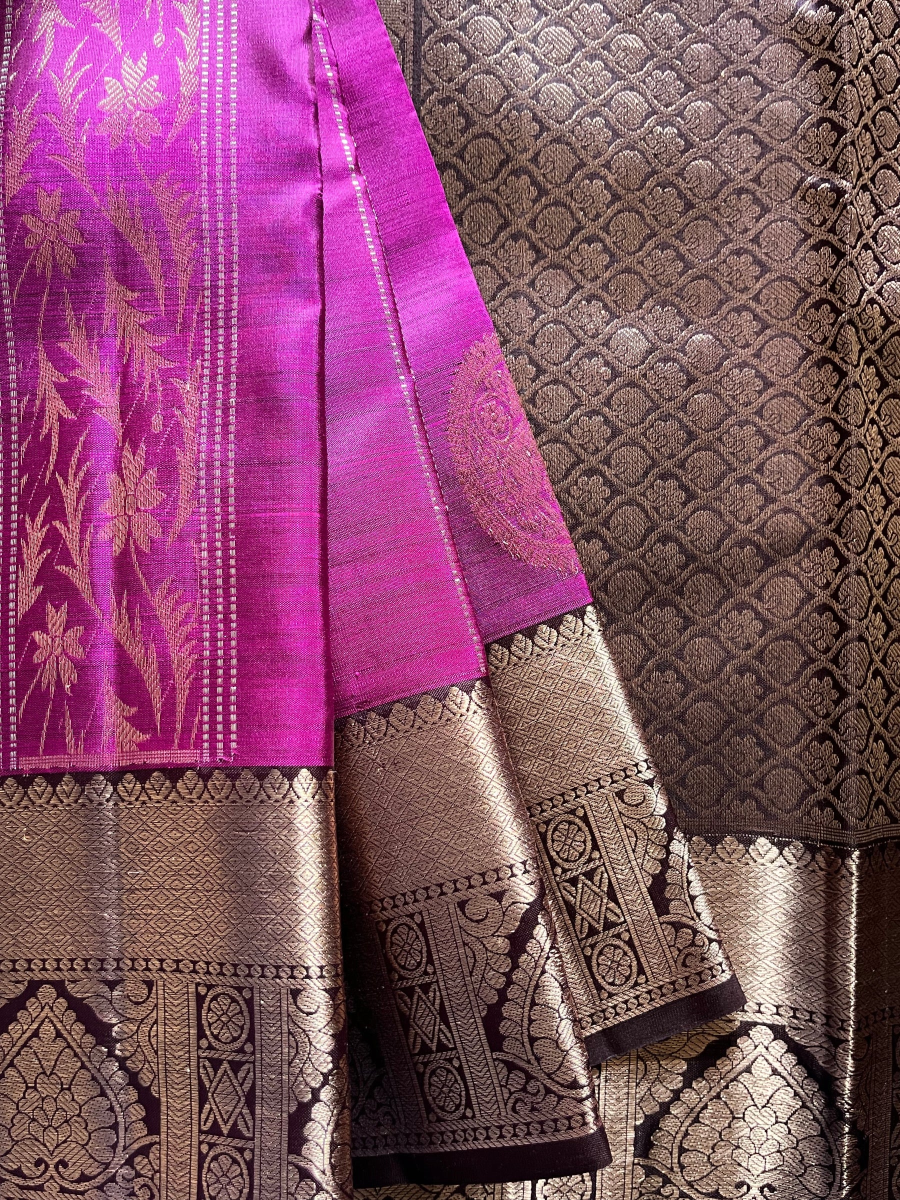 Where temple bells once echoed, weavers now cast medallions of antique gold onto a twilight-purple sky. “Royal Medallion” carries Kanchipuram’s imperial lineage in every shimmer, melding lush silk with roundels depicting mythic steeds and lotus tracery.